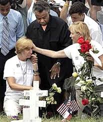 Cindy Sheehan (2005) mourning outside the Crawford Ranch with the usual suspects.